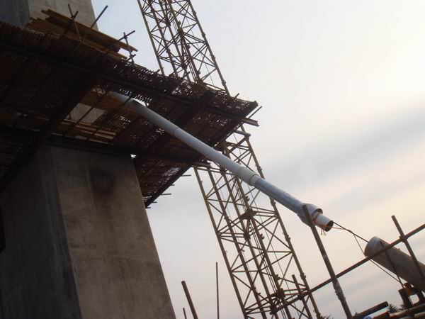 該斜拉索長19.0米,重1噸,由43根鋼絞線組成。據(jù)悉,六安淠望路大橋主塔共有斜拉索60根,由高強(qiáng)度、低松馳的光面鋼絞線組成。單根鋼絞線直徑為15.2mm,標(biāo)準(zhǔn)強(qiáng)度fpk=11860Mpa。斜拉索采用三層防護(hù):第一層涂油脂或石蠟,第二層為單根鋼絞線熱擠單層PE層,第三層整體索外包HDPE雙層護(hù)套。主塔的左、右幅索塔各布置了15對斜拉索,最大索長123.0米,重12噸,由73根鋼絞線組成。 整個(gè)斜拉索施工計(jì)劃到2010年4月份完成。