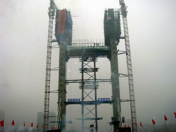 作為整座大橋的控制性工程,主索塔施工一直是各方關(guān)注的焦點(diǎn),并成為影響我項(xiàng)目總體施工進(jìn)度的主要因素。為此,項(xiàng)目部領(lǐng)導(dǎo)班子經(jīng)過(guò)多次研究分析并大膽決策,決定改變以前多點(diǎn)開(kāi)花,齊頭并進(jìn)的工作方向,將工作重心向主索塔偏移,從人員到設(shè)備優(yōu)先滿足主索塔的施工需要。針對(duì)施工過(guò)程中遇到的技術(shù)難題,項(xiàng)目部及時(shí)邀請(qǐng)有關(guān)專家及公司領(lǐng)導(dǎo)到施工現(xiàn)場(chǎng)指導(dǎo),制定解決方案。在積極趕超進(jìn)度的同時(shí),項(xiàng)目部將安全和質(zhì)量擺放在首要位置。在施工過(guò)程中,項(xiàng)目部不僅建立了完善的安全、質(zhì)量保障體系,更積極增加投入,全方位確保主索塔施工質(zhì)量,并使主索塔施工速度得到穩(wěn)步提升。