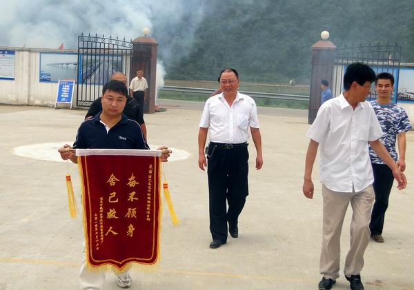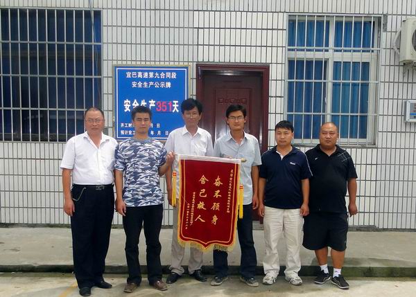 為感謝救人宜昌汽修廠送錦旗到宜巴09標 發(fā)布時間:2010年07月20日 來源:宜巴09標 發(fā)布人: 作者:晏永超 瀏覽:4360次 7月15日,公司宜巴09標項目部禮炮聲隆隆,喜氣洋洋。宜昌市夷陵區(qū)霧渡河鎮(zhèn)富貴汽修廠為感謝公司員工奮不顧身搶救落水人員特送來錦旗,錦旗上寫著“奮不顧身,舍己救人”。 6月26日,福貴汽修廠員工駕車經(jīng)過我項目二工區(qū)馬家河二號橋附近時,突然沖入河中,我部員工王雪松、韋祥峰等見此情景,奮不顧身跳河救人,同時項目部積極調(diào)配車輛設(shè)備,奮力施救,經(jīng)過一個小時的救援,駕駛員獲救。夷陵區(qū)電視臺對此進行報道,引起了強烈的社會反響。 王雪松、韋祥峰等人在接受夷陵區(qū)光電中心記者采訪時謙虛的說,面對危險,任何人都會主動施救,我們只是做了安徽路橋人應(yīng)該做的事情。一個人就是一面旗子,王雪松、韋祥峰等就是安徽路橋的一面旗子,飄揚在宜巴高速路上。