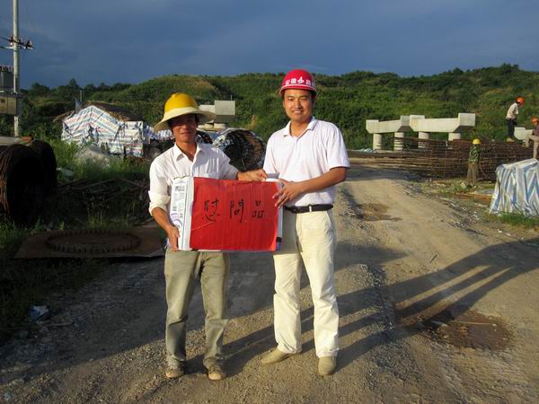 入夏以來,黃祁高速公路建設沿線地區(qū)持續(xù)高溫,廣大項目員工冒著高溫酷暑始終堅守在一線,為加快施工進度而不懈努力。2010年7月18日下午,我部項目經(jīng)理黃華及項目部主要管理人員深入施工現(xiàn)場,慰問廣大員工,檢查各工區(qū)施工隊伍防暑降溫工作的開展情況,并將防暑降溫用品發(fā)放到各工區(qū)施工隊。