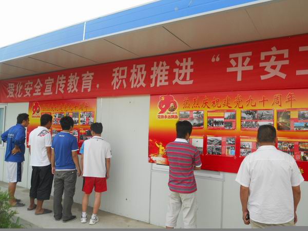 《黨旗永遠(yuǎn)飄揚(yáng)》系列圖片展用大量翔實(shí)的資料照片生動(dòng)地展現(xiàn)了中國(guó)共產(chǎn)黨90年來(lái)的輝煌成就。大家一邊觀看一邊激動(dòng)地議論和感慨:“有了共產(chǎn)黨,才有了中國(guó)翻天覆地的變化,才有了中國(guó)繁榮富強(qiáng)的今天”。通過(guò)參觀,更加激發(fā)了員工們對(duì)中國(guó)共產(chǎn)黨的熱愛(ài)之情,堅(jiān)定了大家的理想信念;激勵(lì)了項(xiàng)目一線員工更加積極的投入到蚌淮高速的施工建設(shè),為實(shí)現(xiàn)公司的“十二五”戰(zhàn)略規(guī)劃做出自己應(yīng)有的貢獻(xiàn)。晚上7點(diǎn),在項(xiàng)目操場(chǎng)上,露天展映的抗日戰(zhàn)爭(zhēng)影片有紅色經(jīng)典影片《七七事變》、《狼牙山五壯士》、《地道戰(zhàn)》,讓大家又受了一次紅色精神的洗禮。
