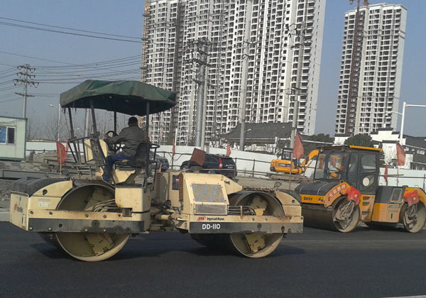 隨著第一輛運料車進入施工現(xiàn)場,攤鋪機開始啟動,倒料、攤鋪、碾壓一條龍作業(yè),路面很快成形。為加快工程進度,現(xiàn)場采用兩臺攤鋪機同時作業(yè)。此次瀝青砼攤鋪長度為1.2公里,懷寧北路路面瀝青攤鋪分三層,當天鋪設的是下面層粗礫石。
