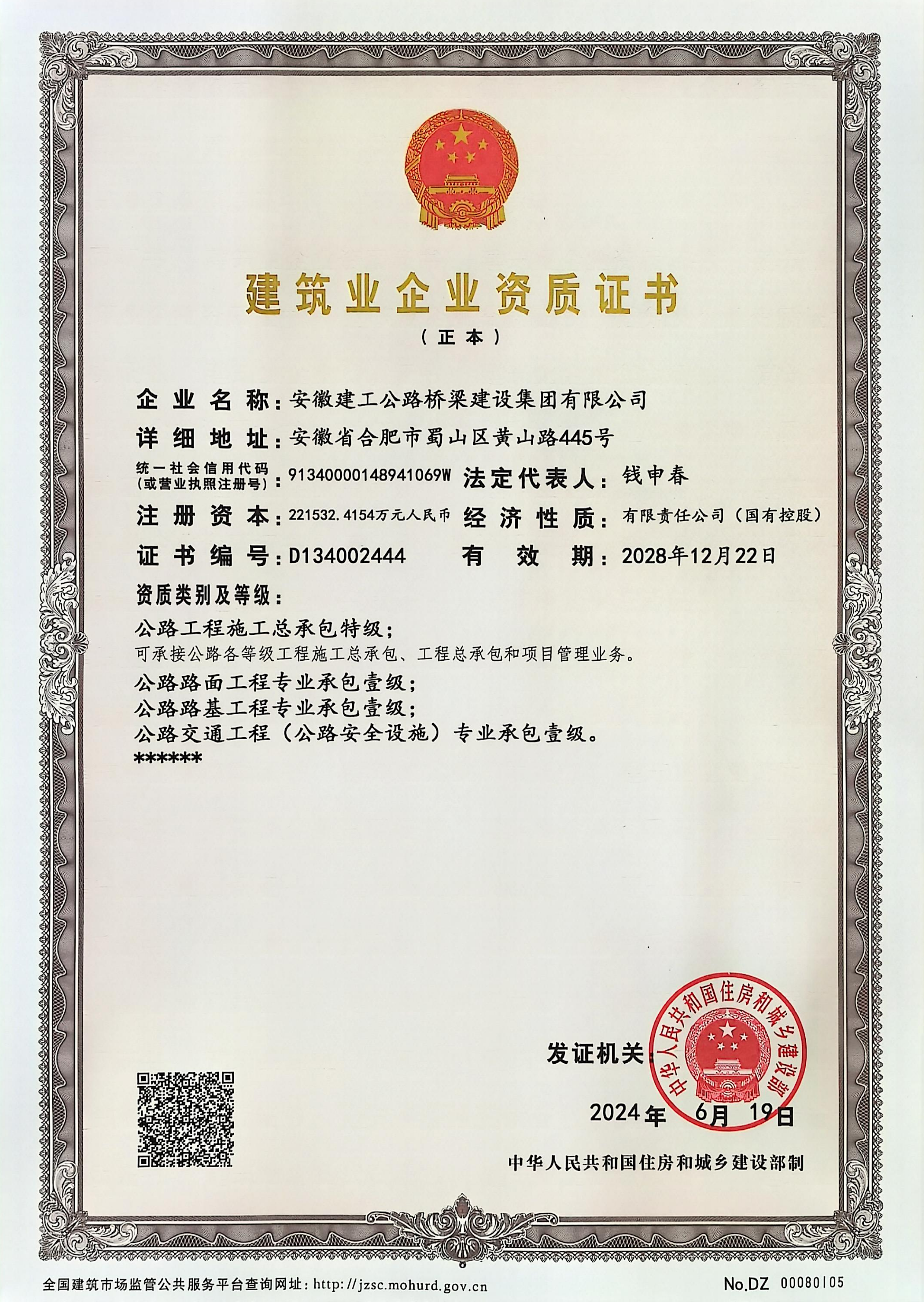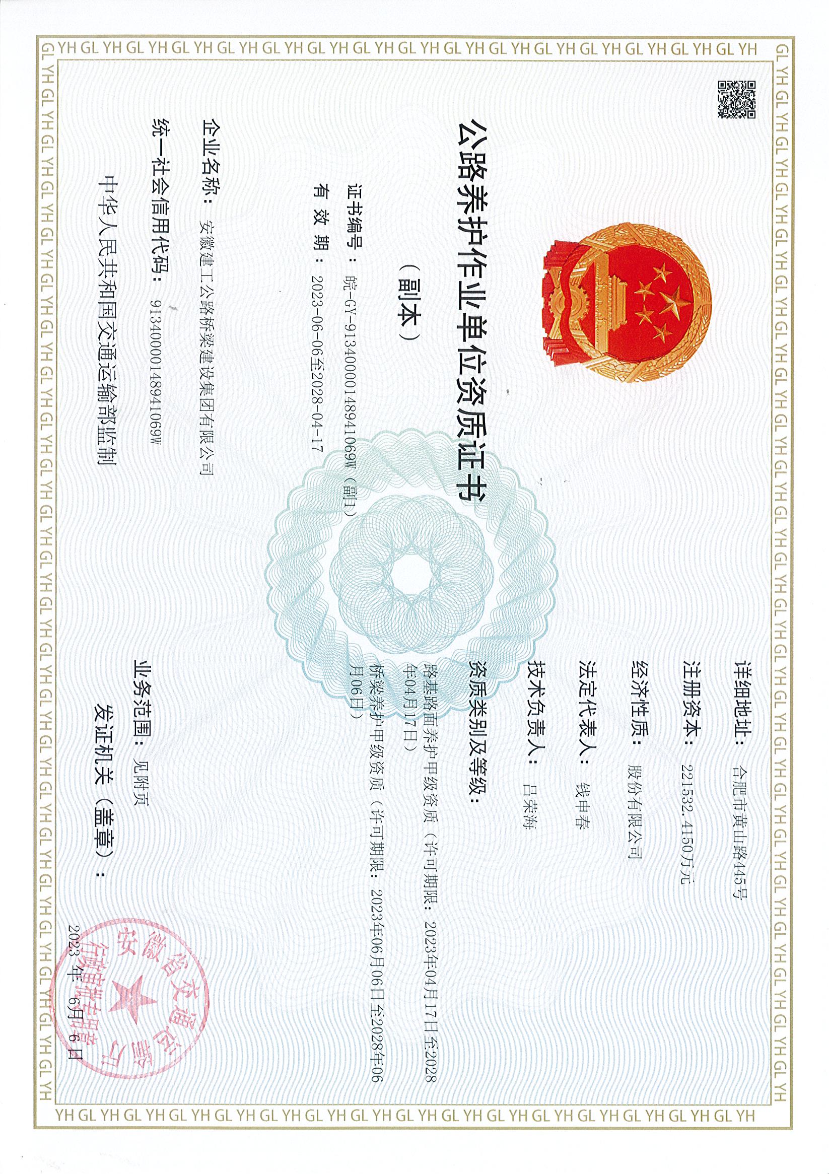 公路工程施工總承包特級(jí)、公路路面工程專業(yè)承包壹級(jí)、公路路基工程專業(yè)承包壹級(jí)、公路交通工程(公路安全設(shè)施)專業(yè)承包壹級(jí)